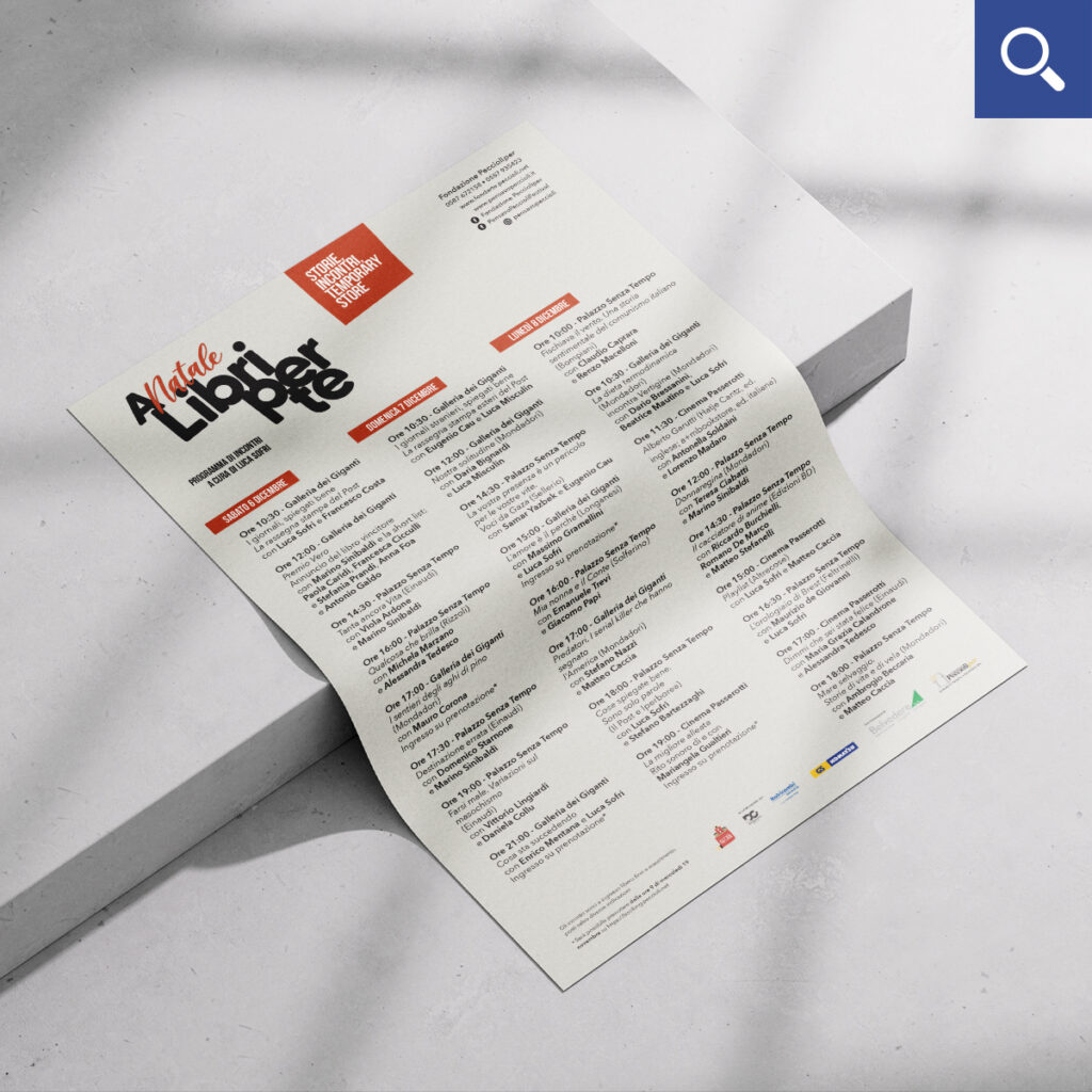 Con il sostegno del Comune di Peccioli e della Fondazione Peccioliper, a cavallo dell’8 dicembre viene allestito un temporary store con librerie del territorio dove poter acquistare libri e dove, dal 2021, hanno luogo anche una serie di presentazioni a cura di Luca Sofri.